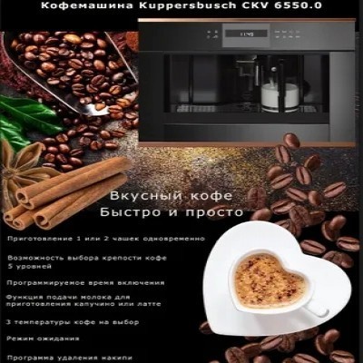 Кофемашина Kuppersbusch CKV 6550.0 ЖК-дисплей с текстовым и графическим полями Электронная система управления с сенсорными кнопками Программируемое количество кофе для 5 размеров чашек (эспрессо, малая, средняя, большая, высокая) Приготовление 1 или 2 чашек Функция подачи молока для приготовления капучино или латте Съемный контейнер для молока с функцией очистки Возможность использования кофейных зерен или молотого кофе Регулируемый по высоте раздатчик кофе Давление при заваривании 15 бар 3 температуры кофе на выбор Возможность выбора крепости кофе (5 предварительно заданных уровней) Отдельные нагреватели для заваривания кофе и приготовления горячей воды Программа удаления накипи Автоматическое ополаскивание при включении и отключении Емкость для воды заполняется спереди Электронный таймер с белыми индикаторами Программируемое время включения Режим ожидания Телескопические направляющие для легкого заполнения кофемашиныПодсветка чашекНаблюдение доставляет удовольствие - хорошо известный факт. Светодиодная подсветка преподносит только что сваренный кофе в правильном свете. И приготовление кофе становится хорошей традициейЕмкость для свежей водыДуховые шкафы и кофемашины Kuppersbusch легко встраиваются в любую кухонную мебель, так как благодаря наличию емкости для свежей воды подсоединение к водопроводу не требуютсяХарактеристики:Потребляемая мощность: 1,35 кВт (вилка Schuko)Размеры прибора (Ш x В x Г): 595 x 455 x 475 мм (вкл. фасад 20 мм и телескопические направляющие) Размеры ниши (Ш x В x Г): 560 x 450 x 550 мм
